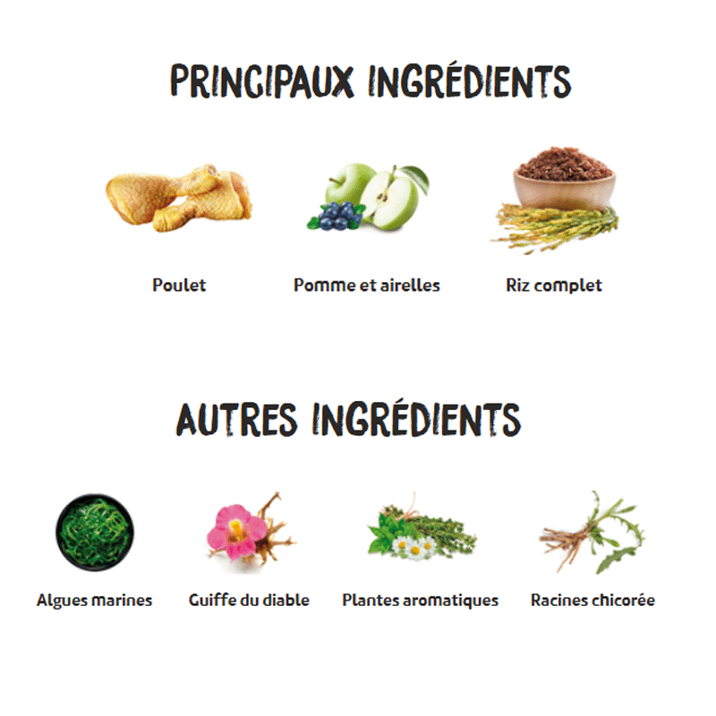 COMPOSITION : Poulet frais* (min. 20% avant cuisson), poulet déshydraté, racines de manioc*, patate douce déshydratée* (10%), maïs complet*, riz complet* (7%), graisse de volaille (conservée avec des antioxydants naturels), saumon hydrolysé (6%), poisson déshydraté, caroube*, protéine hydrolysée de poulet, pulpe de betterave, huile de saumon (conservée avec des antioxydants naturels), levures (nucléotides)* (1,5%), pomme* (1%), graine de lin* (1%), sel gemme*, luzerne déshydratée*, racines de chicorée (FOS)* (2 g/kg), extrait de levure (MOS) (2 g/kg), algues marines déshydratées (Ascophyllum nodosum)* (500 mg/kg), yucca schidigera, myrtilles* (100 mg/kg), harpagophyton* (100 mg/kg), camomille* (100 mg/kg), échinacée* (100 mg/kg), thé vert* (100 mg/kg). *INGRÉDIENTS NATURELS