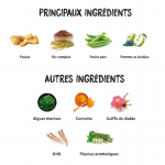 COMPOSITION : Poulet frais* (min. 30% avant extrusion), poulet déshydraté, riz complet* (12%), maïs complet*, pois entiers*, saumon hydrolysé (5%), graisse de volaille (conservée avec des antioxydants naturels), racines de manioc* (4%), caroube*, krill déshydraté* (2,5%), protéine hydrolysée de poulet, pulpe de betterave, huile de saumon (conservée avec des antioxydants naturels) (1,5%), levures (nucléotides)* (1,5%), collagène hydrolysé (1%), pomme* (1%), graine de lin*, sel gemme*, oligosaccharides de fructo et mannan, sulfate de chondroïtine (1500 mg/kg), glucosamine (1000 mg/kg), luzerne déshydratée*, algues marines déshydratées (Ascophyllum nodosum)* (500 mg/kg), yucca schidigera, canneberges* (100 mg/kg), harpagophyton* (100 mg/kg), curcuma* (100 mg/kg), camomille* (100 mg/kg), échinacée* (100 mg/kg), thé vert* (100 mg/kg). *INGRÉDIENTS NATURELS