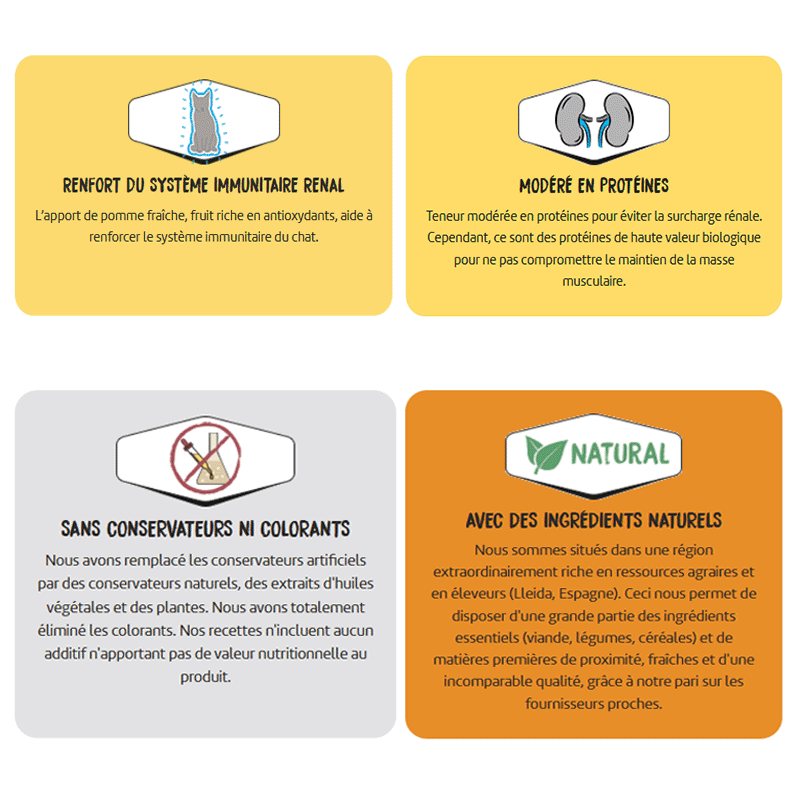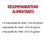Cet aliment innovant ne se contente pas de prendre soin de la santé rénale, il renforce également le système immunitaire du chat. L'inclusion de myrtilles, riches en antioxydants et en vitamines, associée à des minéraux organiques hautement absorbables, contribue à renforcer les défenses naturelles du félin. De plus, la teneur élevée en oméga-3 provenant du saumon ne fait pas seulement soutien au système immunitaire, mais aide également dans la réponse inflammatoire, offrant une approche globale pour le bien-être des chats adultes ayant des besoins rénaux spéciaux.