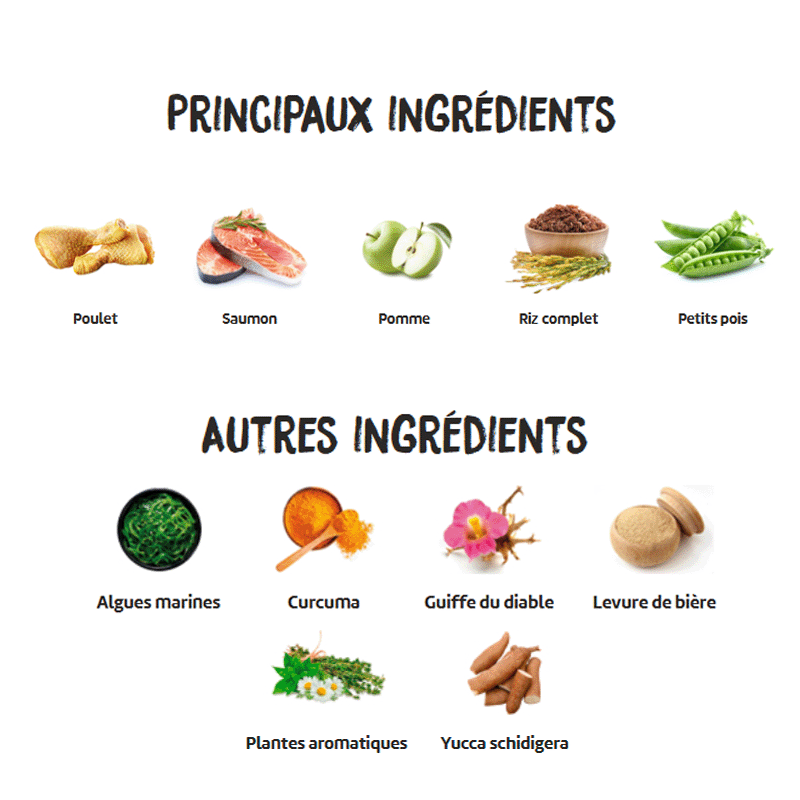 COMPOSITION : Poulet frais* (30 % min. avant extrusion), racines de manioc* (12 %), pomme de terre déshydratée* (12 %), graisse de volaille (conservée avec des antioxydants naturels), riz complet* (8 %), hydrolysat de saumon (7 %), saumon déshydraté (7 %), porc déshydraté, pois entiers* (2 %), protéine hydrolysée de poulet, pulpe de betterave, huile de saumon (conservée avec des antioxydants naturels) (1 %), levure de bière* (1 %), pomme* (1 %), sel gemme*, fructo et manano oligosaccharides, algues marines déshydratées* (Ascophyllum nodosum) (500 mg/kg), yucca schidigera, harpagophyton* (100 mg/kg), curcuma* (100 mg/kg), fleur de camomille* (100 mg/kg), échinacée* (100 mg/kg), thé vert* (100 mg/kg). *Ingrédients naturels