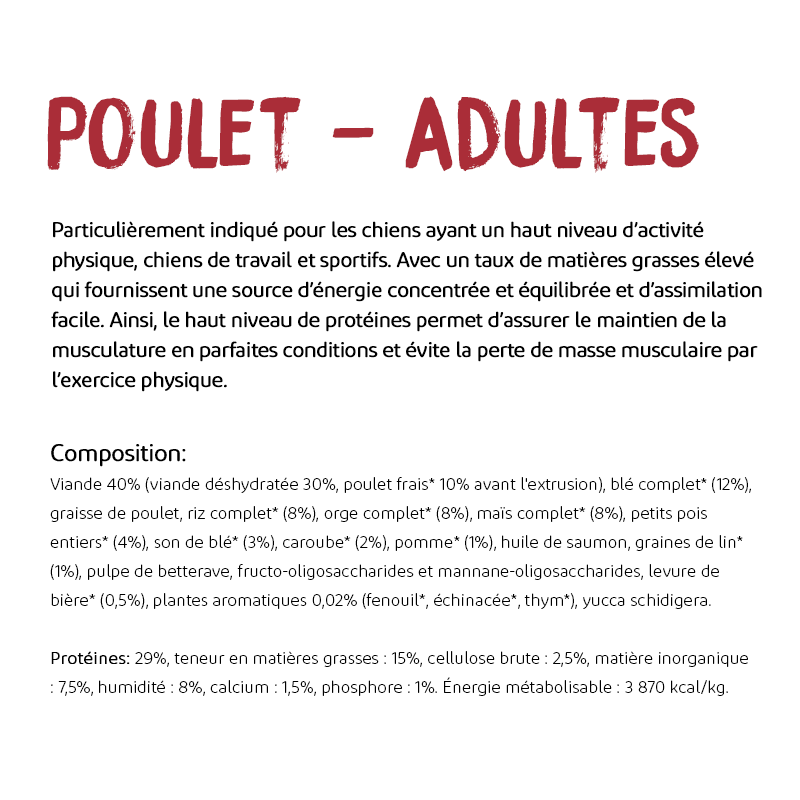 Viandes 40% (viandes déshydratées 30%, poulet frais* 10% avant l'extrusion), blé complet* (12%), graisse de poulet, riz complet* (8%), orge entière* (8%), maïs complet* (8%), pois entiers* (4%), son de blé* (3%), caroube* (2%), pomme* (1%), huile de saumon, graines de lin* (1%), pulpe de betterave, fructo et manano oligosaccharides, levure de bière* (0,5%), plantes aromatiques 0,02% (fenouil*, échinacée*, thym*), yucca schidigera. *INGRÉDIENTS NATURELS