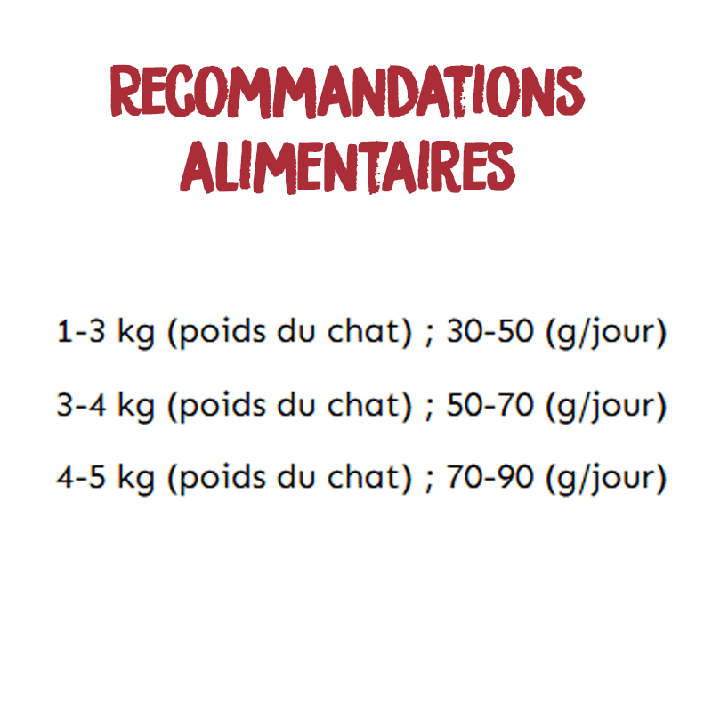 3-4 kg (poids du chat) ; 50-70 (g/jour)