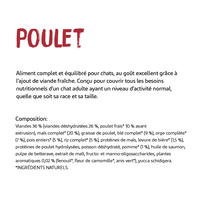 Viandes 36% (viandes déshydratées 26%, poulet frais* 10% avant l'extrusion), maïs complet* (20%), graisse de poulet, blé complet* (9%), orge entière* (7%), pois entiers* (5%), riz complet* (5%), protéines de maïs, levure de bière* (1,5%), protéine hydrolysée de poulet, poisson déshydraté, pomme* (1%), huile de saumon, pulpe de betterave, extrait de malt, fructo et manano oligosaccharides, plantes aromatiques 0,02% (fenouil*, fleur de camomille*, anis vert*), yucca schidigera. *INGRÉDIENTS NATURELS