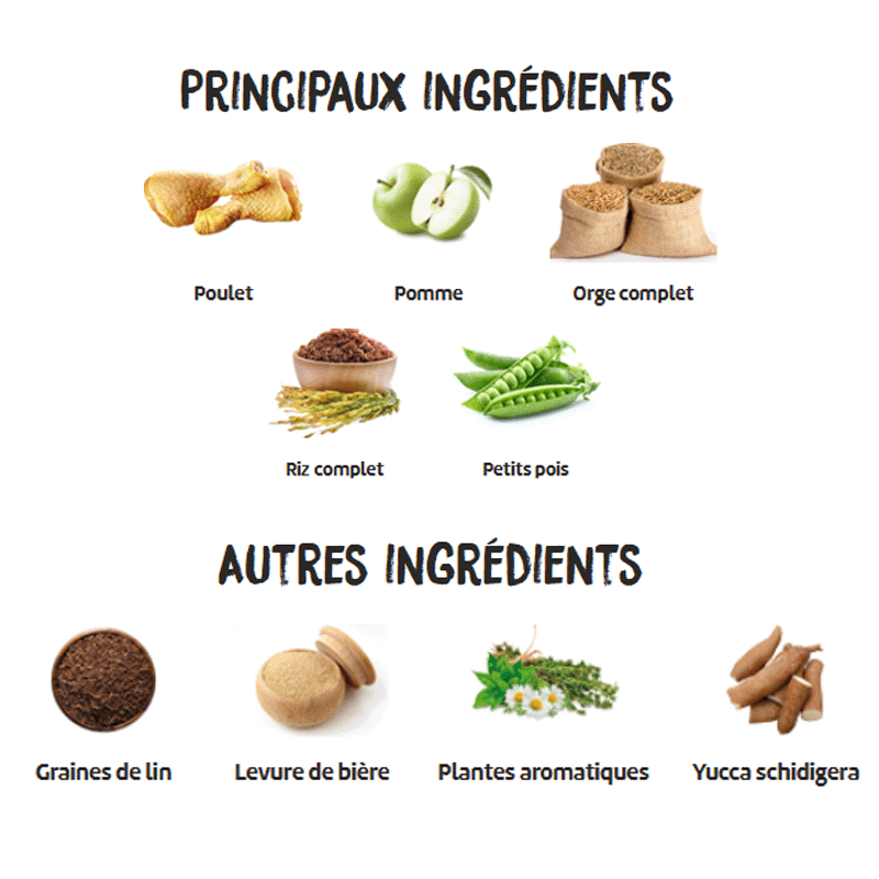 Viandes 38% (viandes déshydratées 28%, poulet frais* 10% avant l'extrusion), riz complet* (15%), graisse de poulet, orge entière* (9%), maïs complet* (7%), protéine de maïs, pois entiers* (4%), poisson déshydraté, levure de bière* (1,5%), protéine hydrolysée de poulet, œuf entier déshydraté* (1%), pomme* (1%), huile de saumon, pulpe de betterave, fructo et manano oligosaccharides, plantes aromatiques 0,02% (fenouil*, fleur de camomille*, anis vert*), yucca schidigera. *INGRÉDIENTS NATURELS