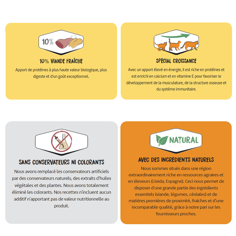 La formule de ces croquettes pour chatons se distingue par son engagement envers la naturalité, car elle n'incorpore ni conservateurs ni colorants artificiels dans sa composition.