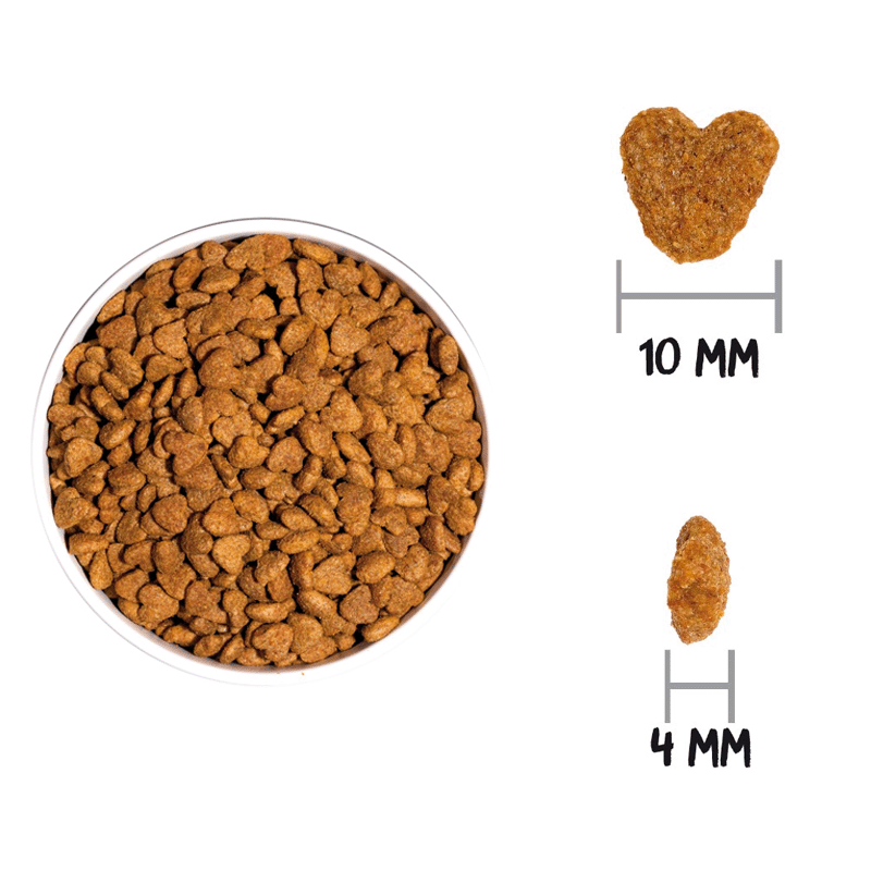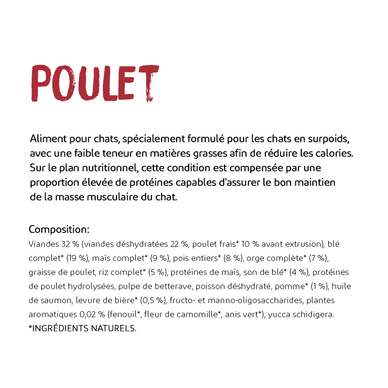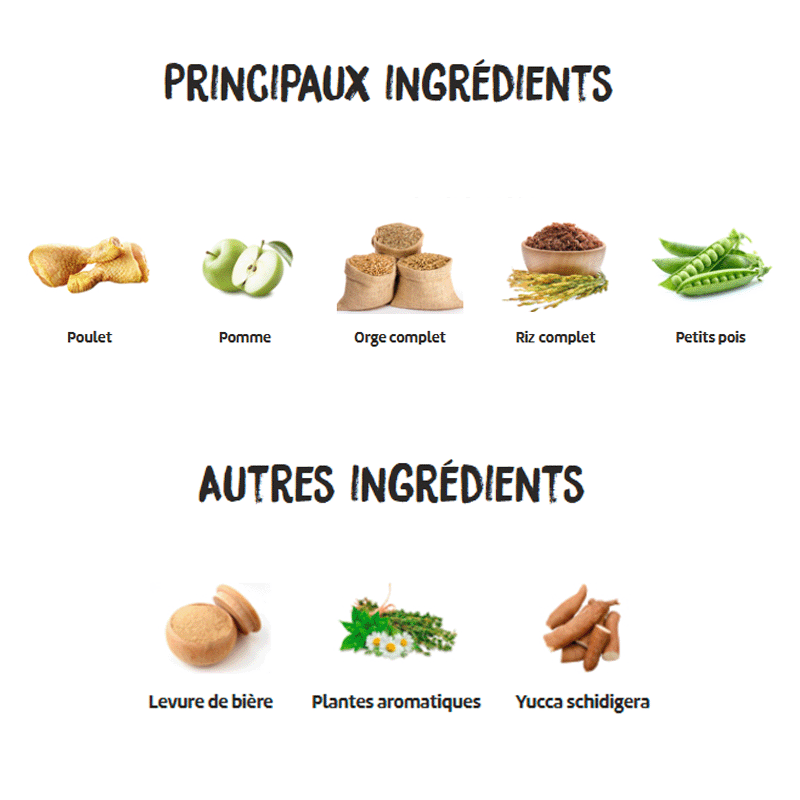 Viandes 32 % (viandes déshydratées 22 %, poulet frais* 10 % avant l'extrusion), blé entier* 19 %, maïs entier* 9 %, pois entiers* 8 %, orge entière* 7 %, graisse de poulet, riz entier* 5 %, protéine de maïs, son de blé* 4 %, protéine hydrolysée de poulet, pulpe de betterave, poisson déshydraté, pomme* 1 %, huile de saumon, levure de bière* 0,5 %, fructo et manano oligosaccharides, herbes botaniques 0,02 % (fenouil*, camomille*, anis vert*), yucca schidigera. *Ingrédients naturels