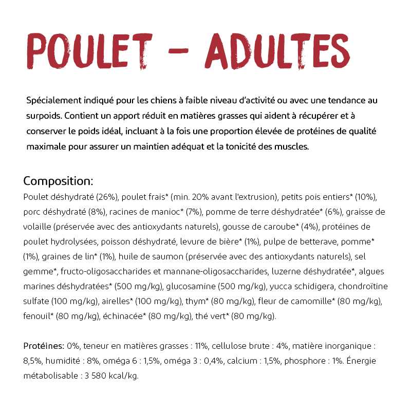 Cette nourriture a été spécifiquement conçue pour les chiens adultes qui doivent contrôler leur poids sans renoncer à une alimentation nutritive et délicieuse. Grâce à sa formule riche en protéines de haute qualité et sa faible teneur en calories, votre chien pourra maintenir un poids sain, améliorer sa santé digestive et profiter d'une peau et d'un pelage plus sains.
