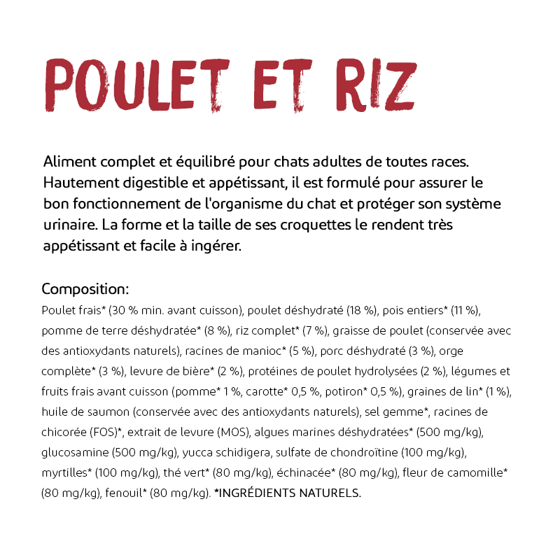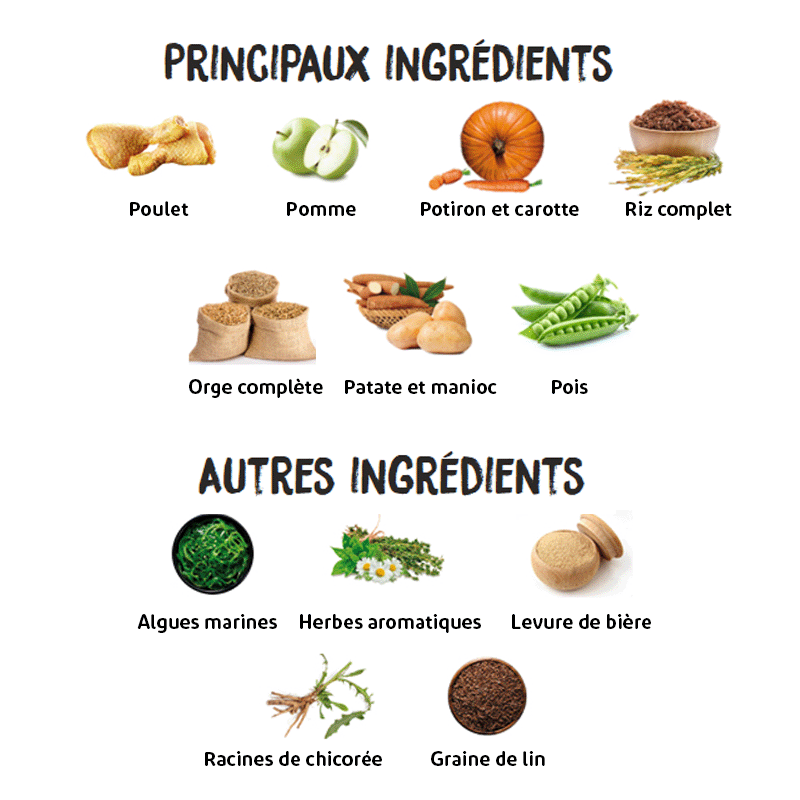 Poulet frais* (au moins 30 % avant cuisson), poulet déshydraté (18 %), pois entiers* (11 %), patate douce déshydratée* (8 %), riz complet* (7 %), graisse de poulet (conservée avec des antioxydants naturels), racines de manioc* (5 %), porc déshydraté (3 %), orge complète* (3 %), levure de bière* (2 %), protéine de poulet hydrolysée (2 %), légumes et fruits frais avant cuisson (pomme* 1 %, carotte* 0,5 %, courge* 0,5 %), graines de lin* (1 %), huile de saumon (conservée avec des antioxydants naturels), sel gemme*, racines de chicorée (FOS)*, extrait de levures (MOS), algues marines déshydratées* (500 mg/kg), glucosamine (500 mg/kg), yucca schidigera, sulfate de chondroïtine (100 mg/kg), canneberges* (100 mg/kg), thé vert* (80 mg/kg), échinacée* (80 mg/kg), camomille* (80 mg/kg), fenouil* (80 mg/kg). *INGRÉDIENTS NATURELS
