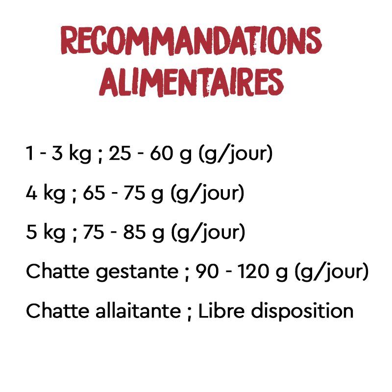 Vitamine A 22 000 UI, vitamine D3 1 800 UI, vitamine E 400 UI, vitamine C 100 mg, taurine 2 000 mg, L-carnitine 100 mg, cuivre (sulfate de cuivre (II) pentahydraté) 6 mg, cuivre (chélate de cuivre (II) d'acides aminés hydraté) 6 mg, manganèse (oxyde de manganèse (II)) 50 mg, zinc (oxyde de zinc) 100 mg, fer (sulfate de fer (II) monohydraté) 40 mg, zinc (chélate de zinc d'acides aminés hydraté) 10 mg, iode (iodure de potassium) 4 mg, sélénium (sélénite de sodium) 0,3 mg, kcal/kg 3 850. Avec des antioxydants naturels.