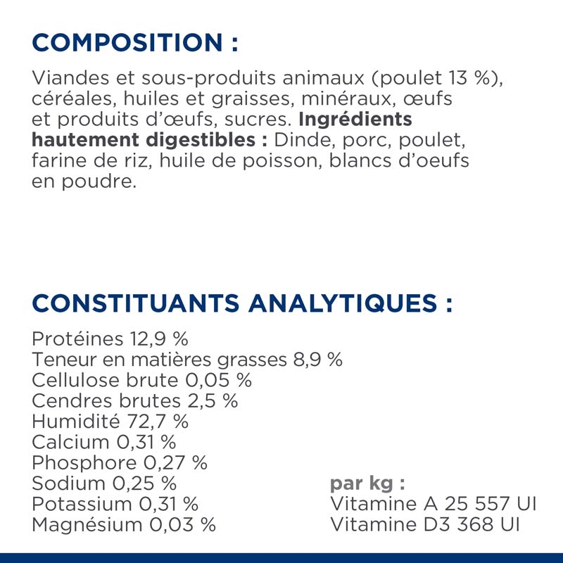 COMPOSITION : Viandes et sous-produits animaux (poulet 13%), céréales, huiles et graisses, substances minérales, œufs et produits d'œufs, sucres. Ingrédients très digestibles : Dinde, porc, poulet, farine de riz, huile de poisson, blancs d'œufs déshydratés.