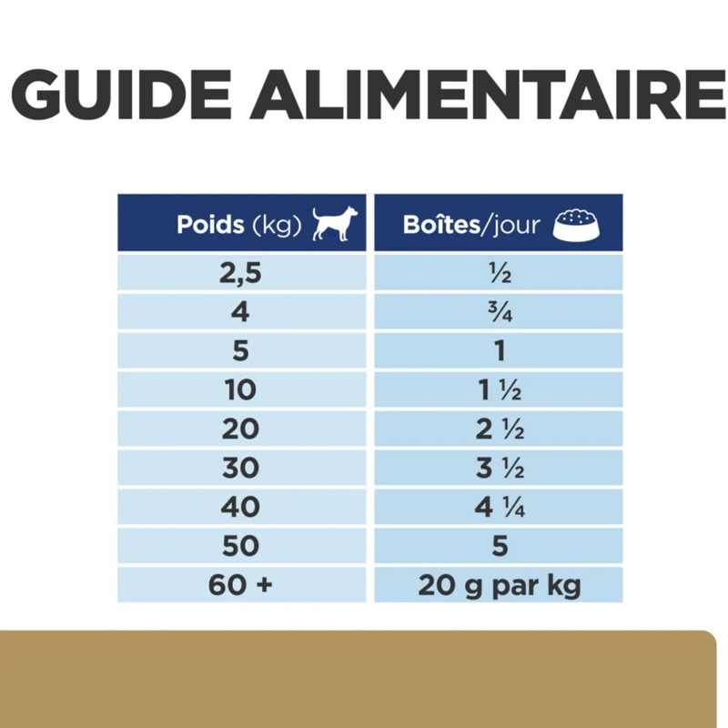 | Poids du chien - kg | Quantité quotidienne - Boîtes de 200 g - Soins intensifs - Repos en cage | Quantité quotidienne - Boîtes de 200 g - Soins intensifs - Chirurgie, sepsis, cancer, traumatisme sévère, fièvre | Quantité quotidienne - Boîtes de 200 g - Soins intensifs - Brûlure grave, traumatisme, traumatisme crânien |