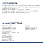 COMPOSITION : Viandes et sous-produits animaux (poulet 5%), céréales, huiles et graisses, sous-produits d'origine végétale, sucres, graines, légumes (1,2%), substances minérales, œufs et produits à base d'œufs. Sources de protéines : poulet, foie de porc, œufs déshydratés. Combinaison de prébiotiques ActivBiome+ Kidney Defense (0,29%) : bêtaïne, son d'avoine, fructo-oligosaccharides.