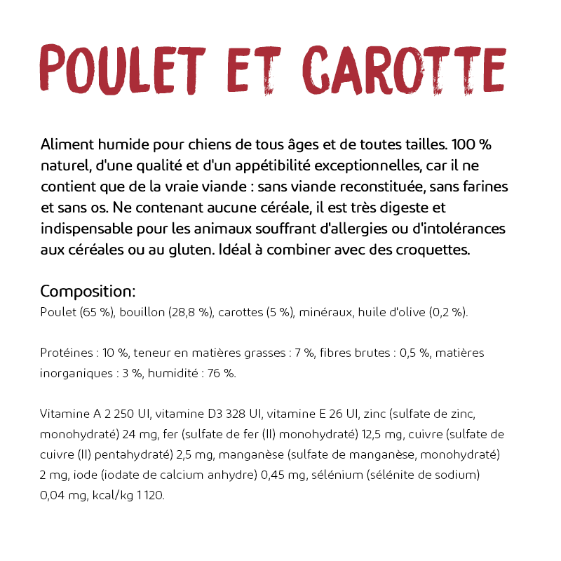 Ingrédients : Poulet (65%), bouillon (28,8%), carotte (5%), minéraux, huile d'olive.