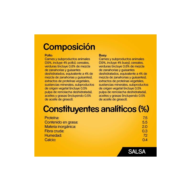 Composants analytiques : Protéine 7,5 % ; matières grasses 5,0 % ; matière inorganique 2,5 % ; fibres brutes 0,60 % ; humidité 82,0 %.