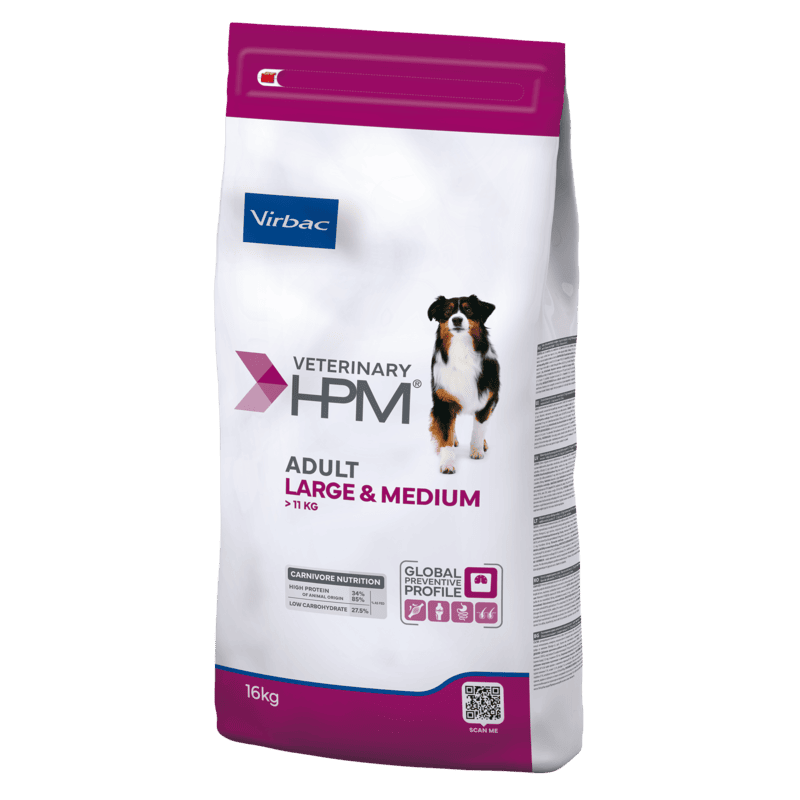 VETERINARY HPM Adult Dog Medium & Large se présente comme une alimentation complète destinée aux chiens de races moyennes (10-25 kg) à partir de 12 mois, et aux chiens de races grandes (>25 kg) à partir de 18 mois.