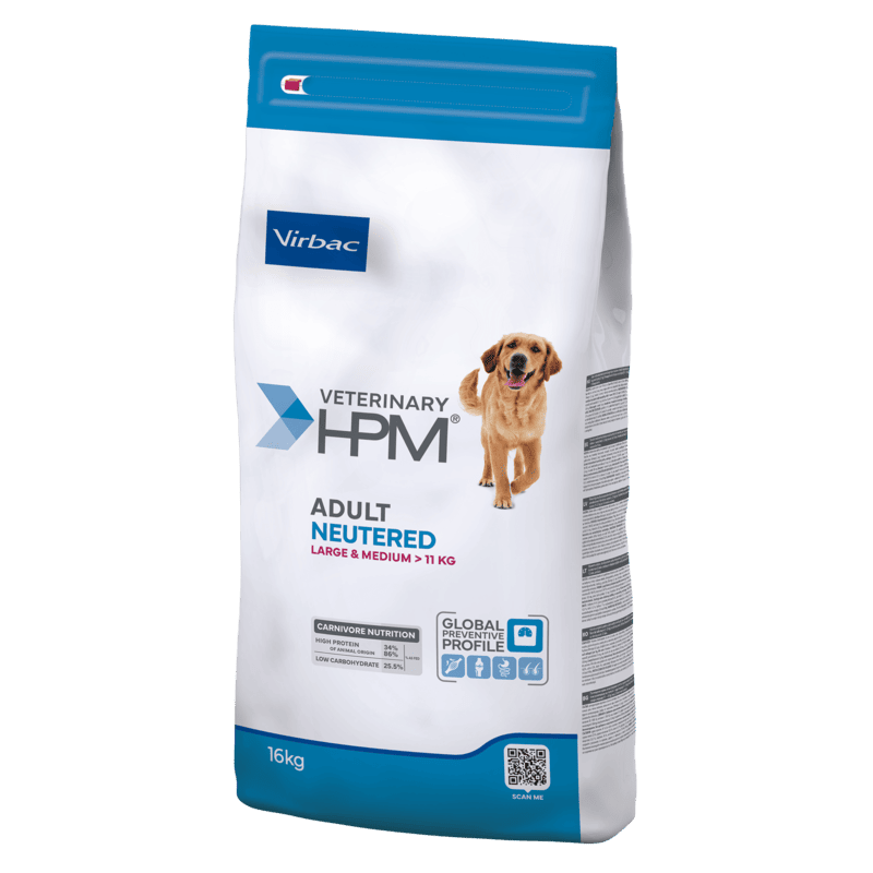 Veterinary HPM Adult Neutered Dog Large & Medium est une alimentation complète pour les chiens adultes stérilisés, destinée aux grandes races (> 25 kg) à partir de 18 mois et aux moyennes races (10-25 kg) à partir de 12 mois.
