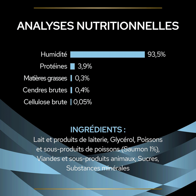 Composition : Lait et produits laitiers*, Glycérol, Poissons et sous-produits de poissons (saumon 1 %), Sucres, Substances minérales. *Protéine de lactosérum en poudre.