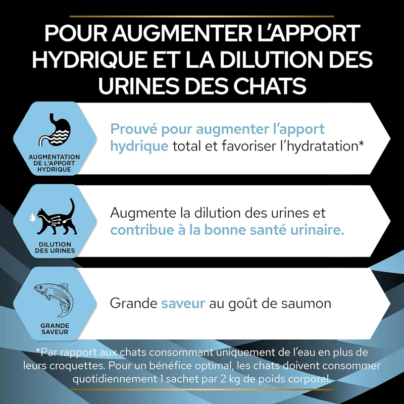 Parce que c’est une solution pratique, sûre et validée par des études scientifiques conduites par des vétérinaires et nutritionnistes Purina. Idéal pour les chats buvant peu, les chats âgés ou ceux ayant des antécédents de problèmes urinaires, ce complément renforce efficacement leur hydratation quotidienne et améliore leur qualité de vie.