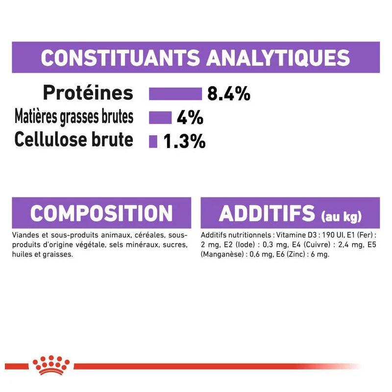 Por otro lado, el contenido de grasa del paté Sterilised de ROYAL CANIN® es moderado, y una combinación óptima de fibra alimentaria le ayuda a mantener un peso ideal y a sentirse saciado.