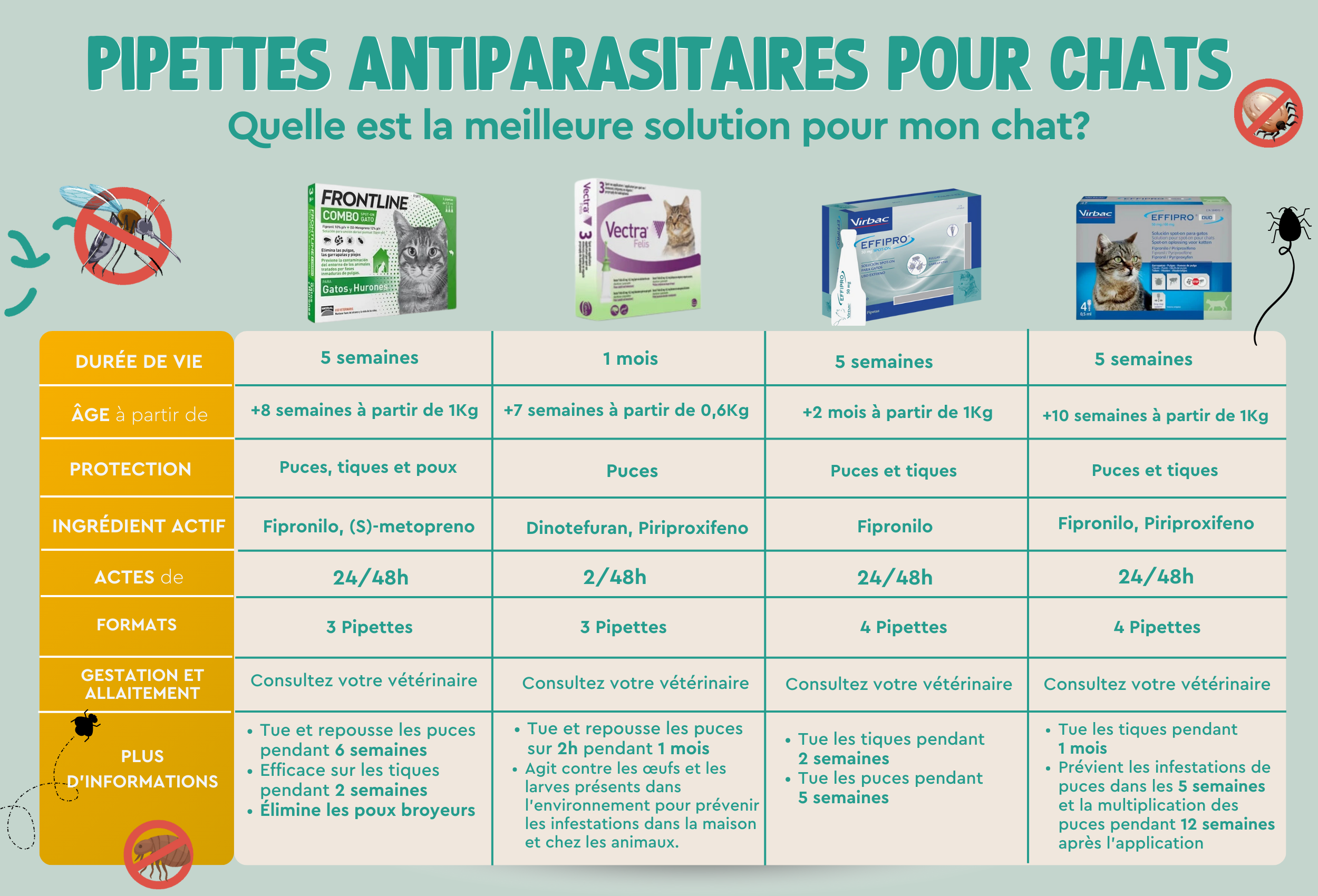 Les pipettes antiparasitaires sont très simples à utiliser. Elles sont commercialisées sous forme d'ampoules monodoses dont le contenu est réparti sur la peau de l'animal (pas sur le poil), principalement dans la zone du cou et de la poitrine, bien que son application dépende de la taille de votre compagnon. Il s'agit d'une méthode de protection très efficace et très pratique. Savez-vous quelle pipette correspond le mieux à vos besoins ? Vous pouvez voir une comparaison très claire dans l'image suivante.