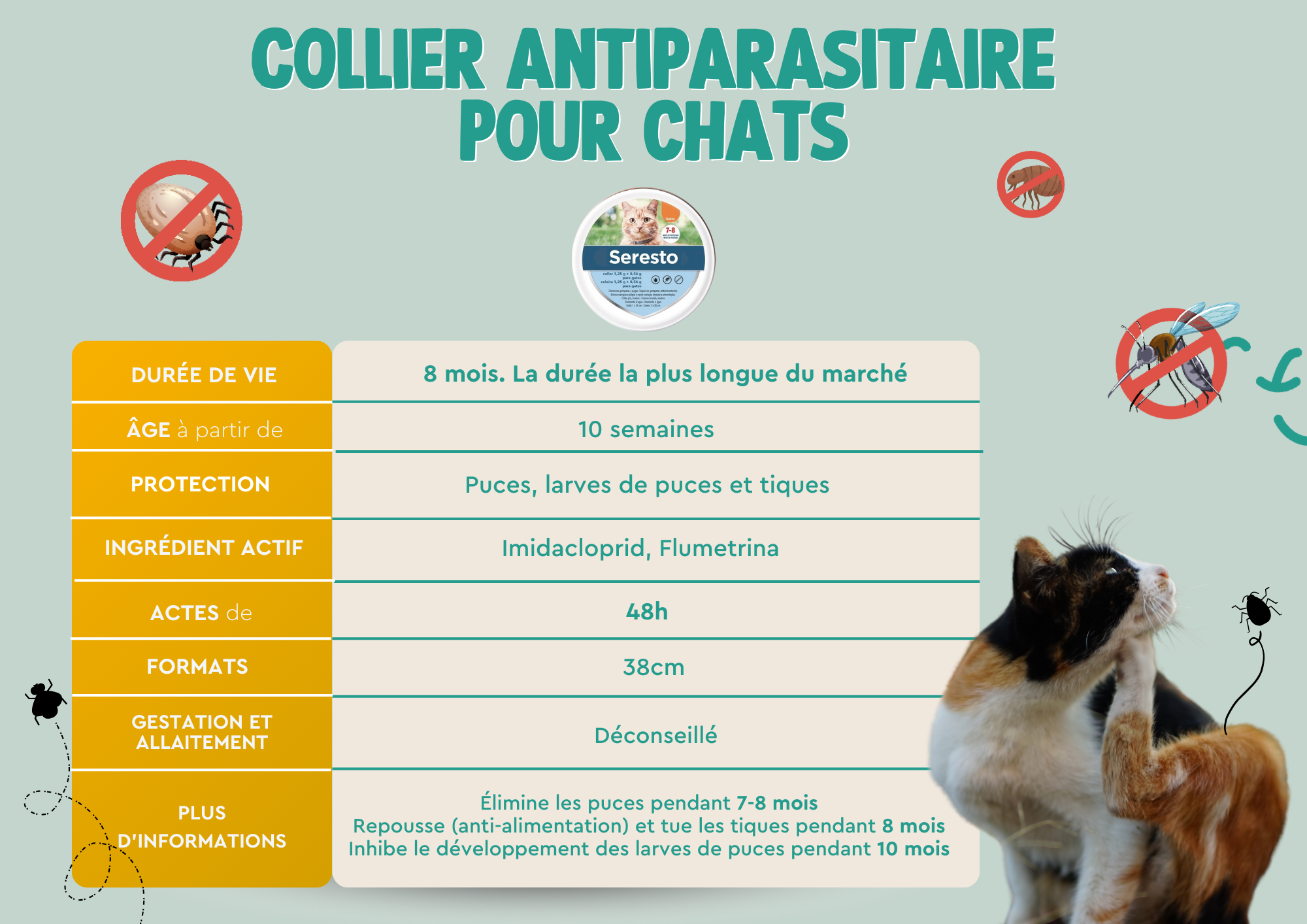 Le collier antiparasitaire offre de longues périodes d'efficacité et est très facile à utiliser. Il suffit de le mettre autour du cou de l'animal en laissant un espace de deux doigts entre la peau et le collier, et il libérera progressivement les principes actifs qui protégeront votre compagnon. Pour être efficaces, les colliers doivent être portés en permanence. Voici une comparaison des colliers pour chiens et des colliers pour chats qui vous aidera à choisir le produit parfait en fonction de sa durée, de sa protection et d'autres facteurs essentiels.