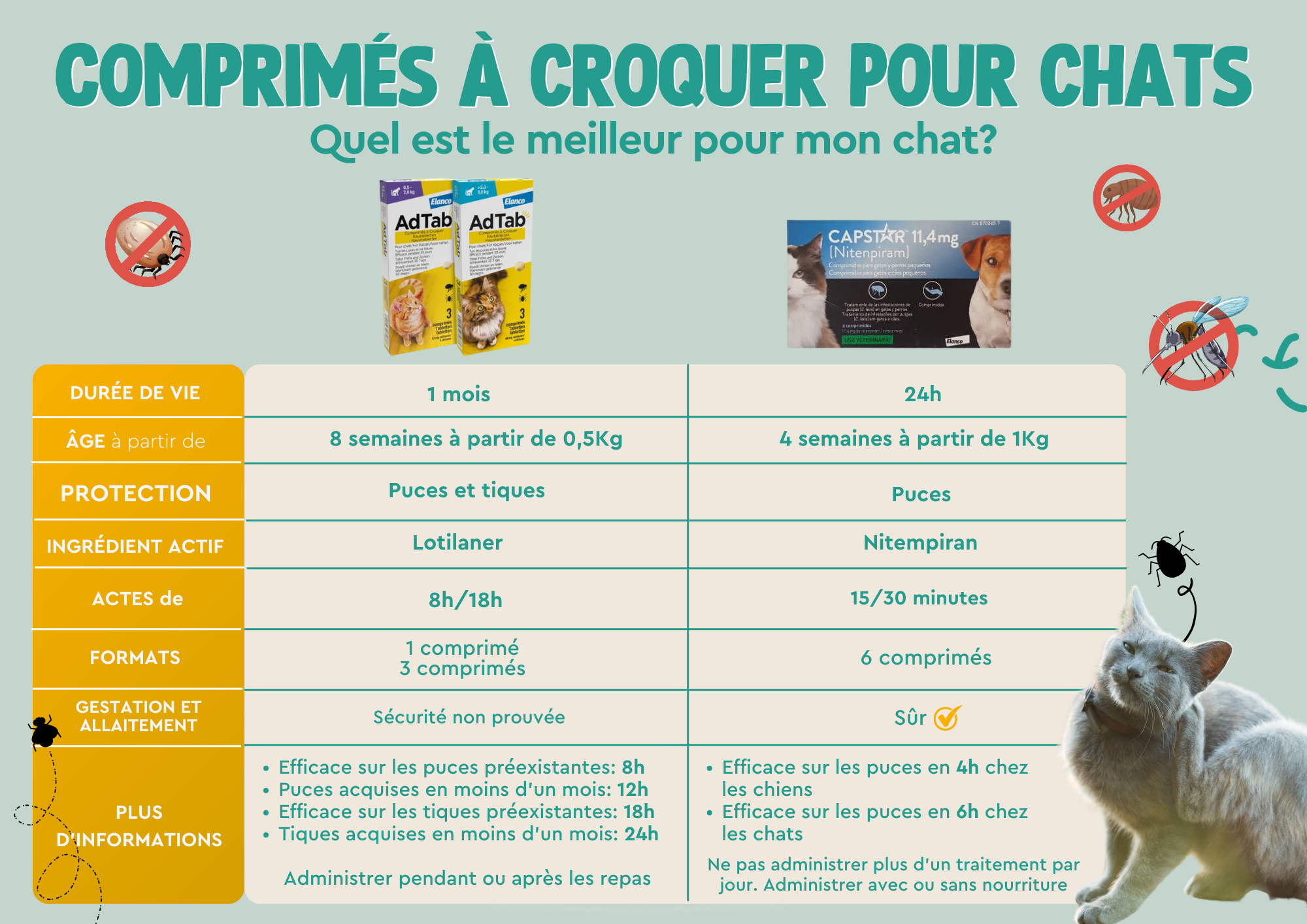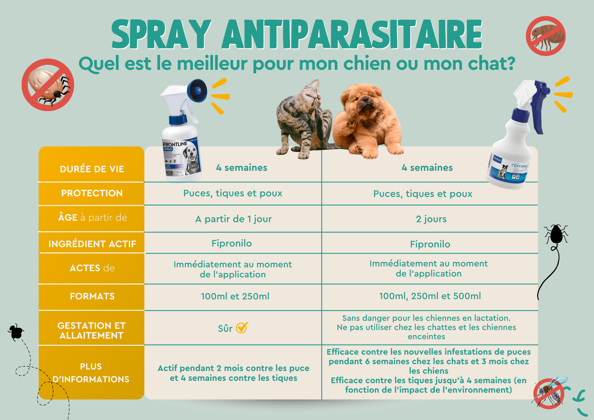 Chez Guaw, nous ne travaillons qu'avec des produits totalement sûrs et adaptés à votre animal. Nous souhaitons maintenant vous présenter une comparaison qui pourra vous être très utile lors du choix de votre antiparasitaire. Et comme toujours, si vous avez des questions, nous disposons d'un service client qui répondra à toutes vos interrogations et vous aidera à choisir la meilleure option pour vous.