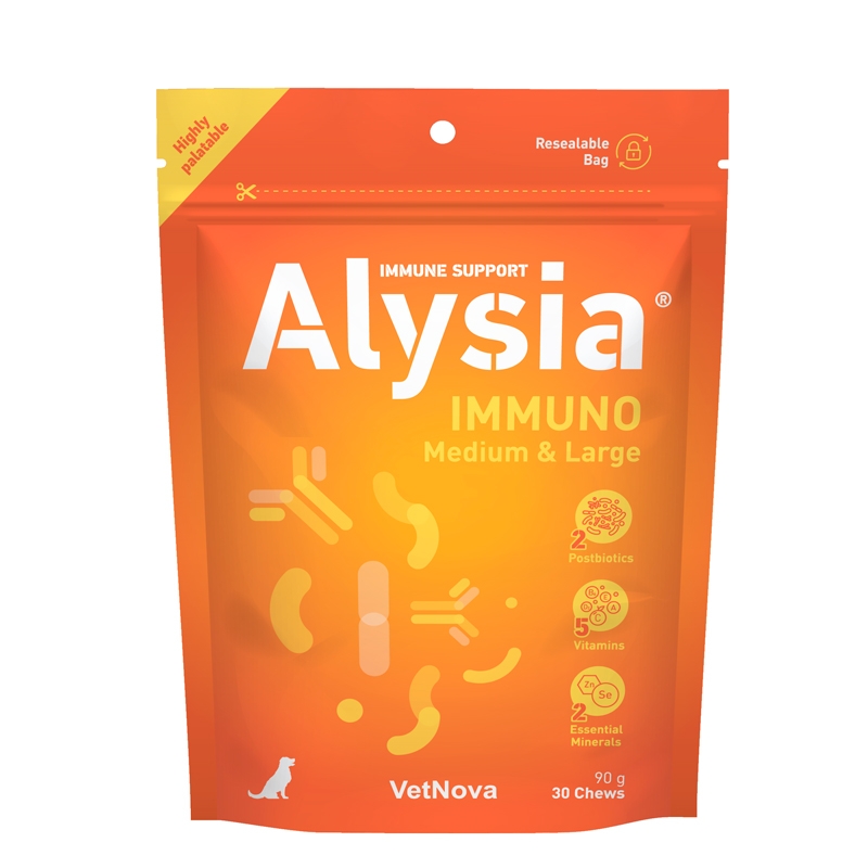 Le complément immunitaire Vetnova Alysia Immuno Chews est conçu pour chiens moyens et grands nécessitant un renforcement de leurs défenses naturelles. Sa formule avancée combine des nutriments essentiels pour soutenir la santé immunitaire et protéger l'animal contre les agents externes.