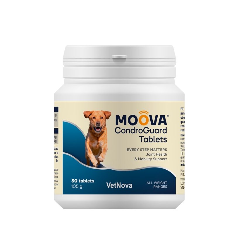 Moova CondroGuard Tablets est une solution efficace, sûre et facile à administrer, conçue pour préserver la mobilité de l'animal, assurer son confort et soutenir son activité quotidienne sans anti-inflammatoires pharmaceutiques.