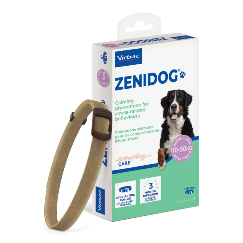 Collier Zenidog avec phéromones apaisantes pour chiens aide au contrôle du stress chez les chiens en continu pendant 3 mois, avec tailles S pour petits chiens (jusqu’à 10 kg) et chiots, et M/L pour chiens de 10 à 50 kg.