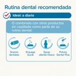 La proteasa actúa desintegrando la estructura proteica de la placa antes de que se forme el sarro, mientras que la glucosa oxidasa descompone la glucosa en ácido glucónico, generando un efecto antibacteriano. Además, este gel dental no contiene flúor y su sabor a carne lo hace fácilmente aceptado por las mascotas. Su boquilla larga facilita su aplicación.