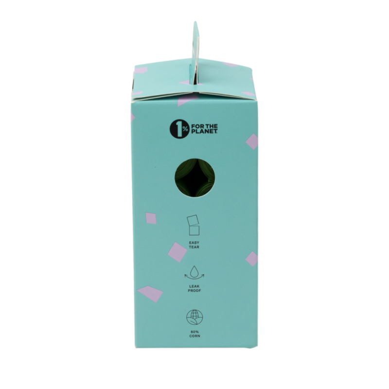 Bolsas higiénicas biodegradables para perro con Aroma Fresh, resistentes, antifugas y fáciles de separar, elaboradas con 60% maíz y embalaje de cartón reciclado sin plástico.