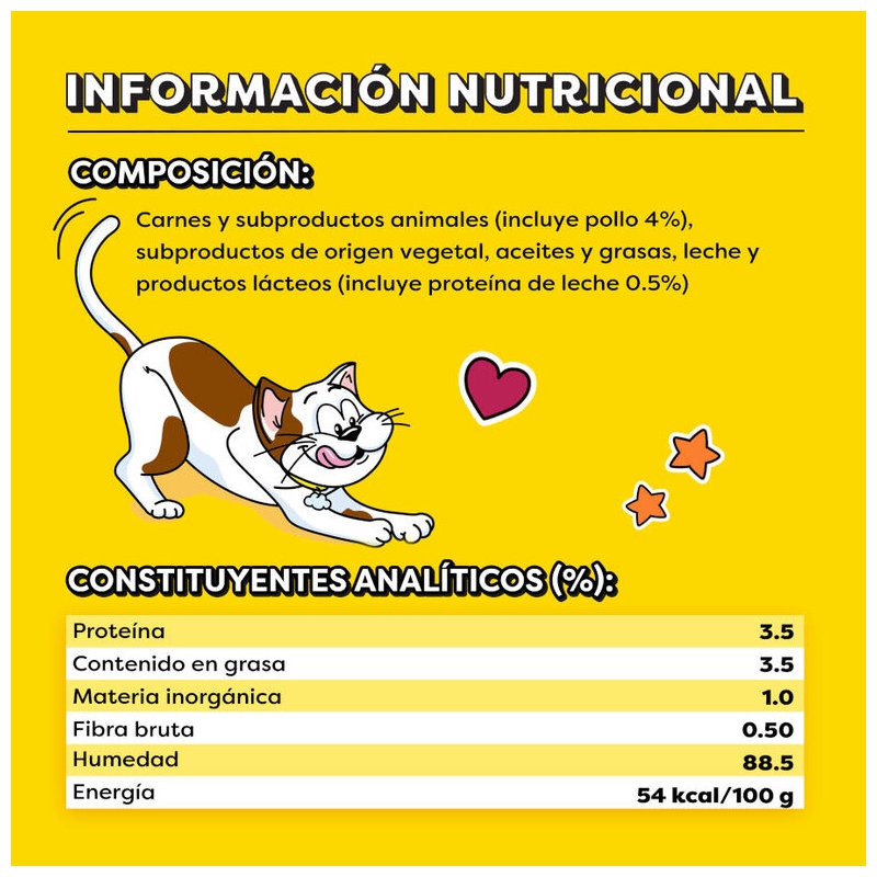 Su textura cremosa y su sabor irresistible a pollo hacen que cada bocado sea una experiencia única. Gracias a su alto contenido de humedad, este snack contribuye a la hidratación diaria de tu felino, ayudando también a una digestión saludable.