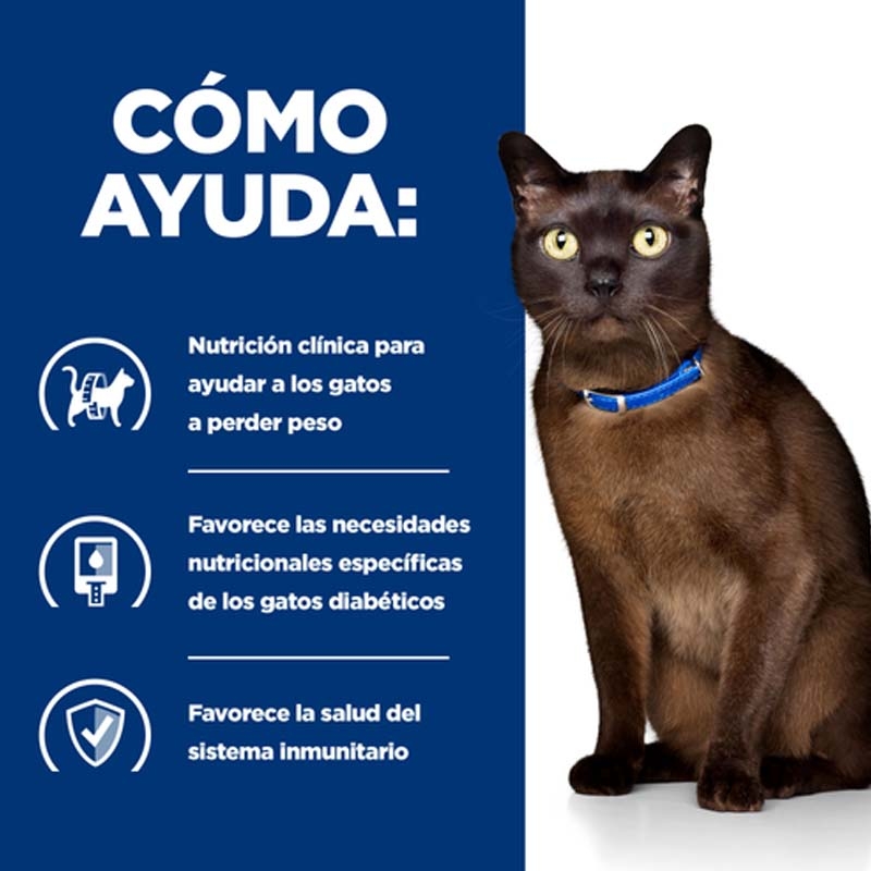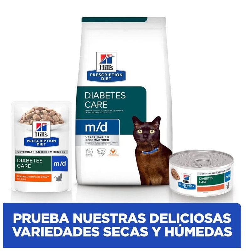 Hill's Prescription Diet m/d es un alimento dietético completo diseñado para apoyar a los gatos con diabetes mellitus y a aquellos que necesitan controlar o reducir su peso. Su fórmula especializada ayuda a regular los niveles de glucosa en sangre y a favorecer una pérdida de peso segura, manteniendo la masa muscular y el bienestar general del gato.