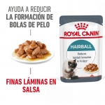Hairball Care en salsa de ROYAL CANIN® está especialmente formulado para abordar el problema de las bolas de pelo en gatos. Cuando los gatos se acicalan, pueden ingerir pelo que luego se acumula en su sistema digestivo, causando incómodas bolas de pelo. Esta fórmula ayuda de forma natural a estimular el tránsito intestinal, facilitando la eliminación del exceso de pelo y evitando su acumulación en el estómago. Además, contribuye al mantenimiento del peso ideal gracias a su bajo contenido de grasa, tan solo 2.7%, y proporciona energía mediante ácidos grasos esenciales.