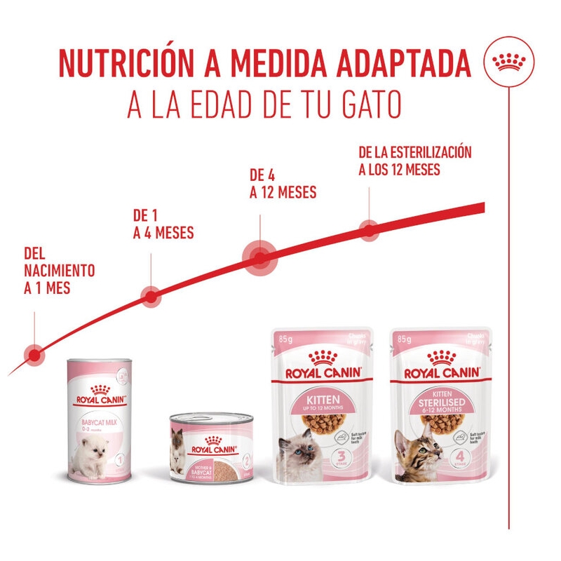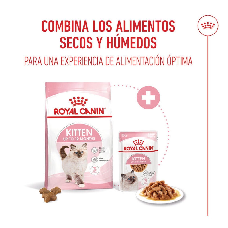 Para adaptarse a las preferencias individuales de cada gatito, Kitten de ROYAL CANIN® también está disponible en formato de alimento húmedo con deliciosa gelatina o como un suave y sabroso paté.
