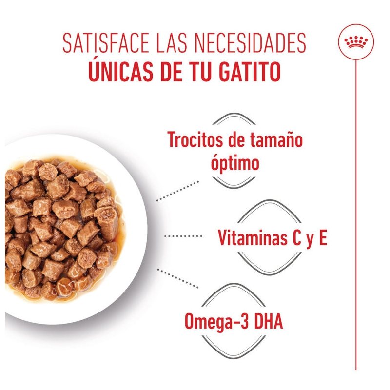 Por esta razón, Kitten en salsa de ROYAL CANIN® proporciona todos los nutrientes esenciales necesarios para cubrir sus elevados requisitos de energía y fomentar un desarrollo óseo óptimo, además de mantener una buena salud en general.