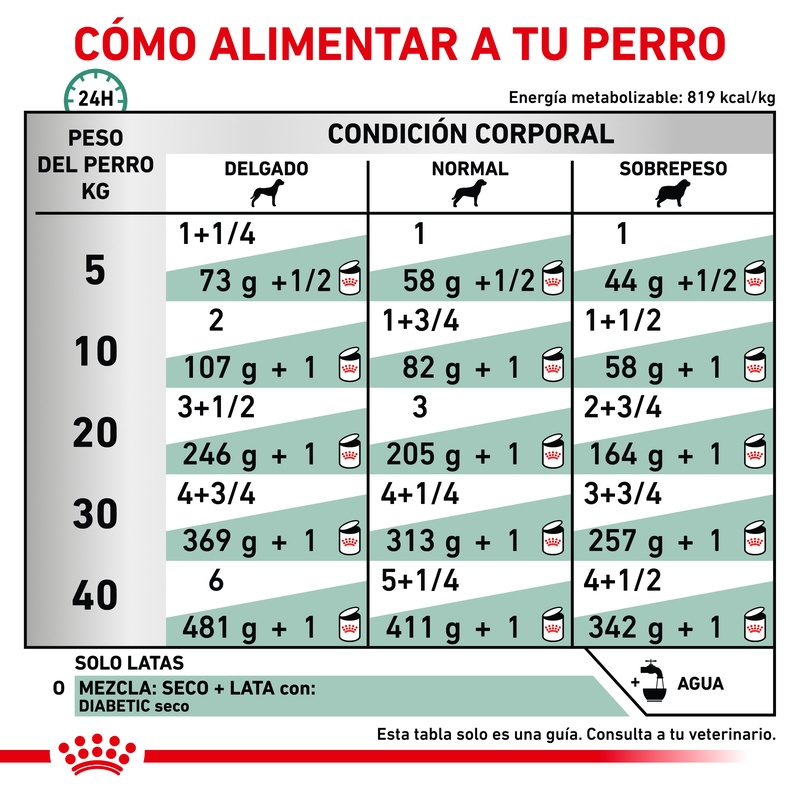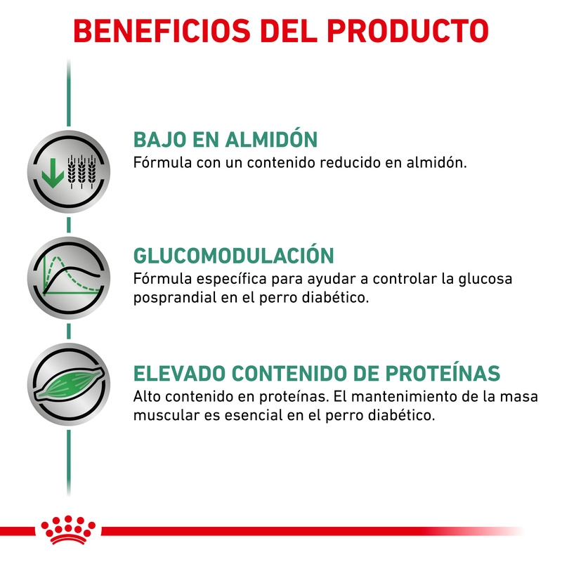 Este alimento debe utilizarse bajo supervisión veterinaria, especialmente en perros diagnosticados con diabetes mellitus u otros problemas metabólicos. Respeta las raciones diarias indicadas por el profesional y realiza los cambios de dieta de forma gradual durante varios días para favorecer una buena aceptación y tolerancia digestiva.