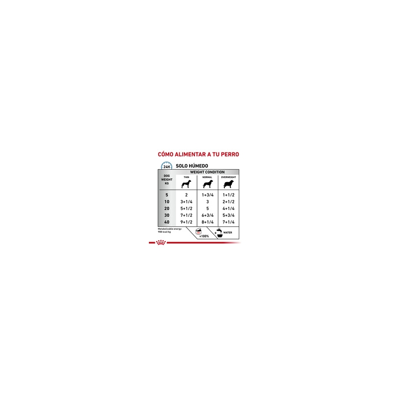 La cantidad de esta comida húmeda hipoalergénica para perros debe ajustarse al peso del perro, a su condición corporal, nivel de actividad y a las recomendaciones del veterinario. Utiliza la siguiente tabla como guía orientativa y adapta las raciones según la respuesta del animal: