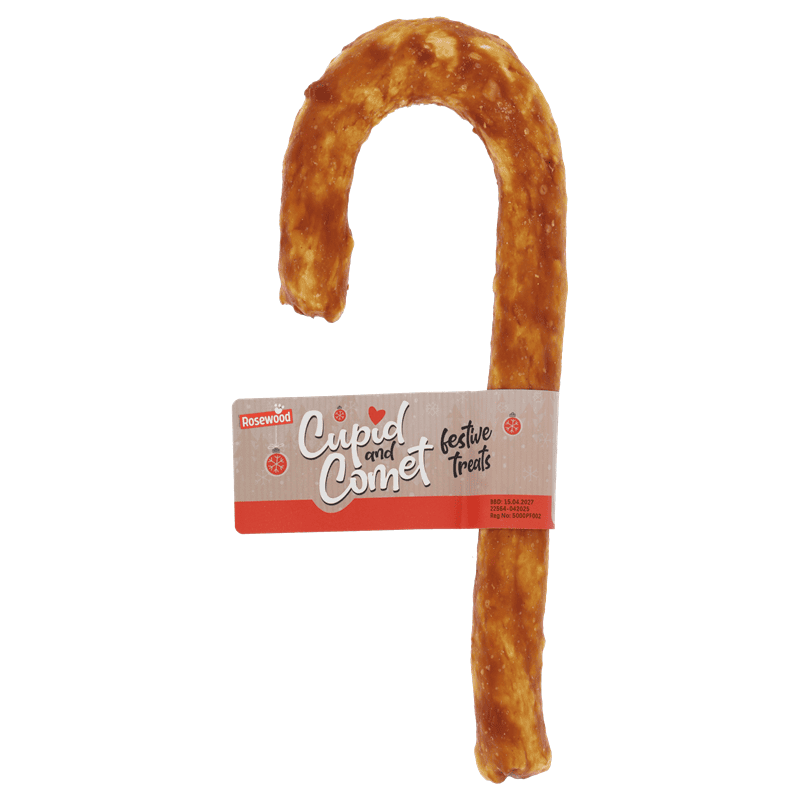 Snack navideño para perros en forma de bastón de colágeno con pollo, alto en proteína y de baja grasa, pensado para mimar y apoyar articulaciones, piel y pelo.