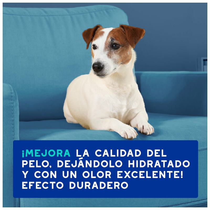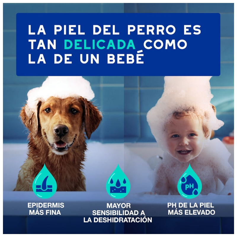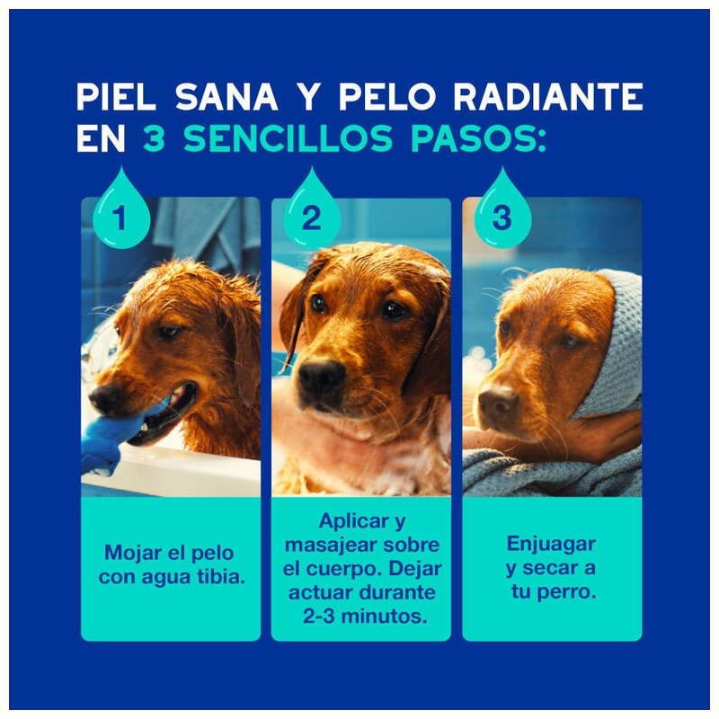 Aplicar una cantidad adecuada de champú sobre el pelaje mojado del perro, masajear suavemente hasta obtener espuma y dejar actuar durante unos minutos. Aclarar abundantemente con agua tibia. Repetir si es necesario. Evitar el contacto con los ojos y mucosas.