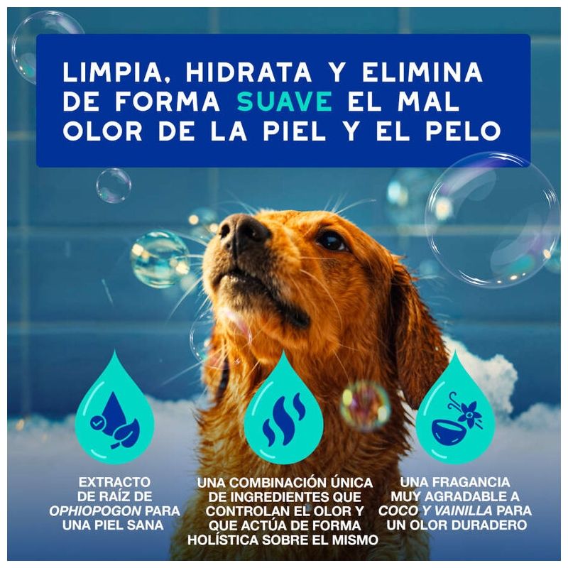 Este champú contiene un 97 % de ingredientes de origen natural y está libre de sulfatos, parabenos y siliconas. Enriquecido con un complejo de activos con propiedades anti-olores de larga duración, actúa de manera global sobre los olores desagradables, manteniendo el equilibrio cutáneo y proporcionando confort a las pieles más sensibles.