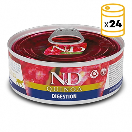 N&D Quinoa Feline es una opción de comida húmeda completa y equilibrada para el cuidado nutricional de gatos adultos, especialmente diseñada para abordar problemas específicos como la mala digestión y la insuficiencia pancreática exocrina. Esta fórmula dietética completa, llamada Digestion lata, ofrece una alternativa nutritiva y deliciosa para los gatos que necesitan cuidado especial en su dieta. Con un 45% de lomo y paleta de cordero, proporciona proteínas magras de alta calidad, esenciales para la salud muscular y la vitalidad general del gato.