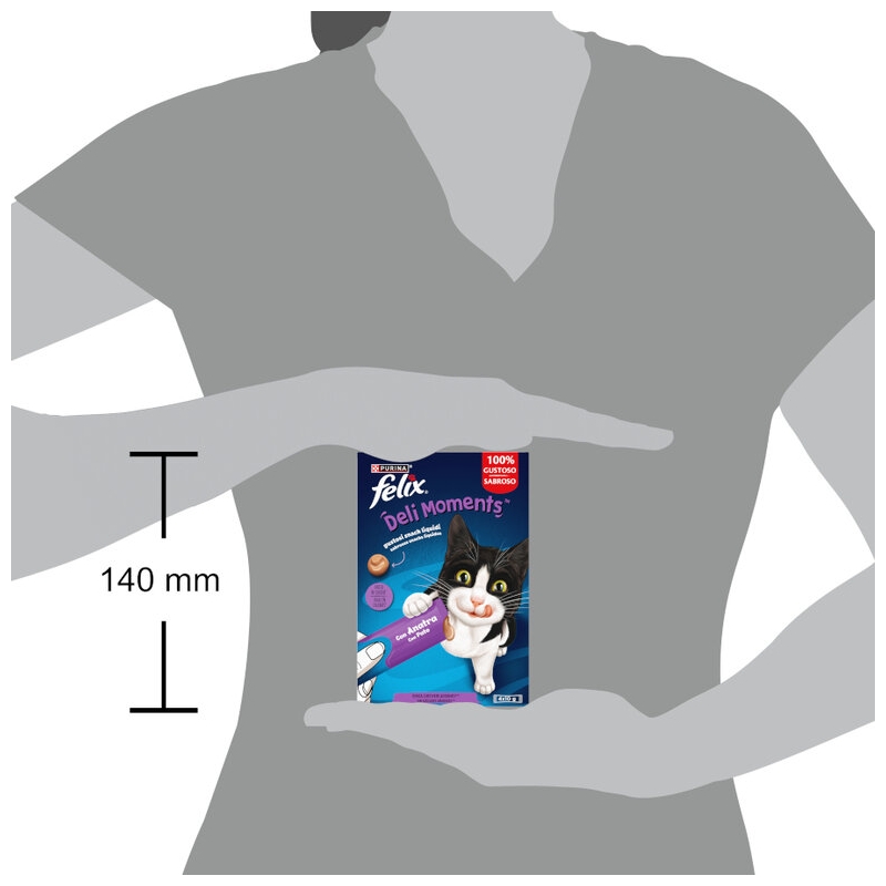 Felix Deli Moments con Pato es un snack líquido para gatos adultos, con una textura cremosa y sabor a pato, ideal para premiar a tu felino en momentos especiales.