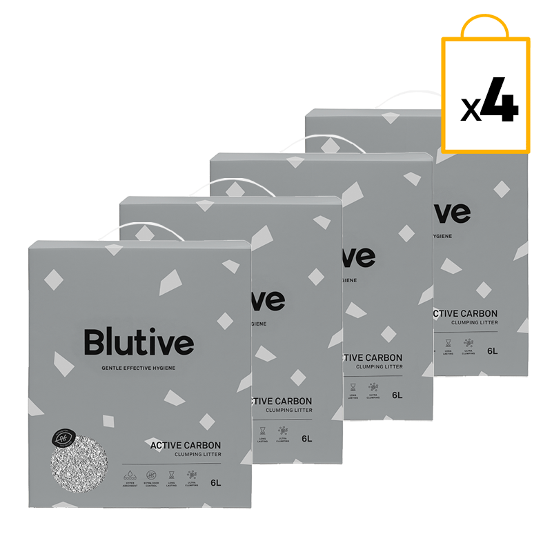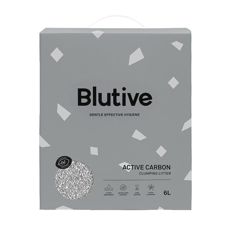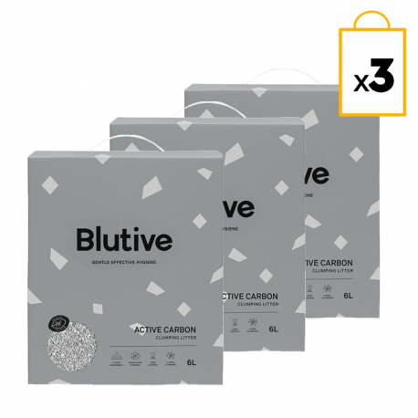 La litière Blutive avec Charbon Actif est présentée sous forme de 6 litres, parfait pour garantir une durée d'utilisation de 4 à 6 semaines, selon le nombre de chats et leurs habitudes. Cette présentation assure une utilisation pratique et efficace.