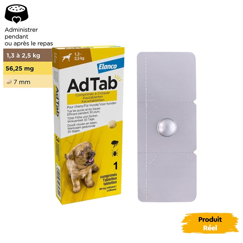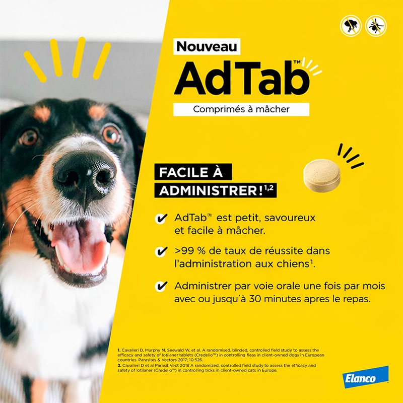 Élaboré par Elanco, AdTab est facile à administrer, car il est mâchable et peut être mélangé à la nourriture ou administré après le repas. Avec un agréable arôme de viande, votre chien acceptera ce comprimé sans problème, assurant des soins efficaces et agréables.