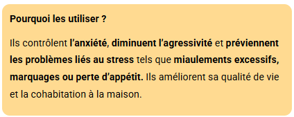Ils contrôlent l’anxiété, diminuent l’agressivité et préviennent les problèmes liés au stress tels que miaulements excessifs, marquages ou perte d’appétit. Ils améliorent sa qualité de vie et la cohabitation à la maison.