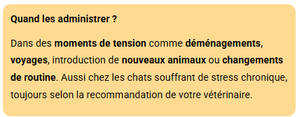 Dans des moments de tension comme déménagements, voyages, introduction de nouveaux animaux ou changements de routine. Aussi chez les chats souffrant de stress chronique, toujours selon la recommandation de votre vétérinaire.
