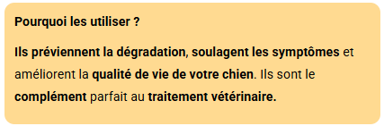 Ils préviennent la dégradation, soulagent les symptômes et améliorent la qualité de vie de votre chien. Ils sont le complément parfait au traitement vétérinaire.