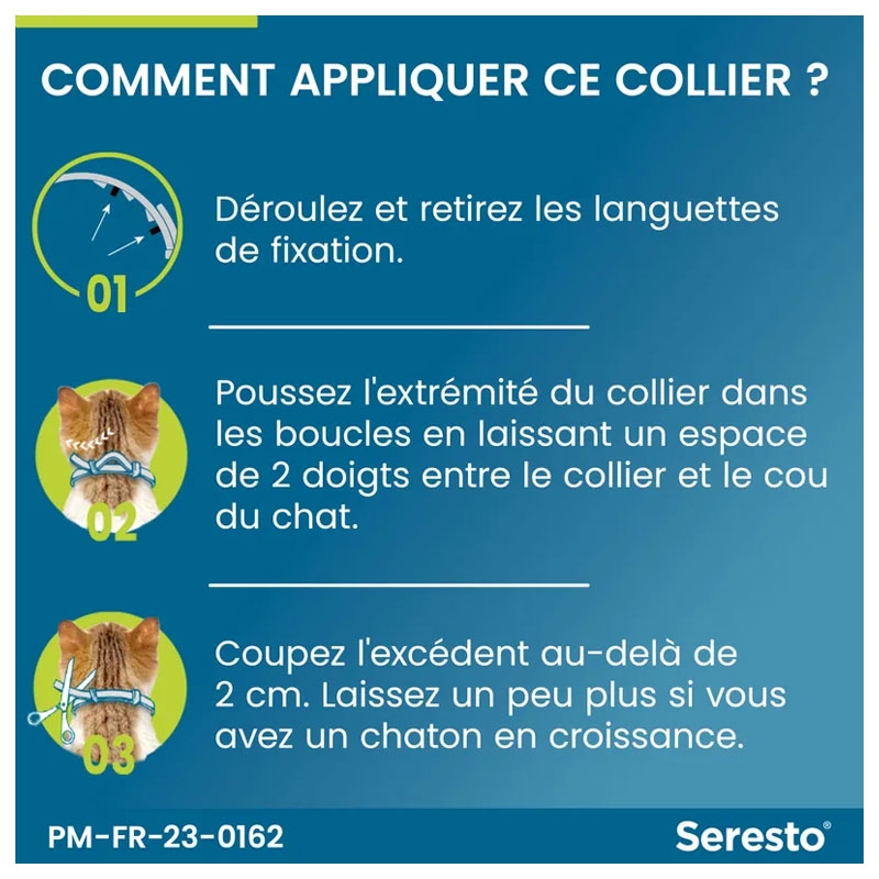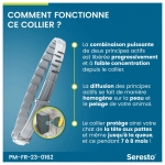 Le Seresto libère des doses appropriées de manière constante pendant jusqu'à 8 mois. Les principes actifs sont transférés sur la peau et le pelage du chat, offrant une protection contre les tiques et les puces, et réduisant le risque de leishmaniose.