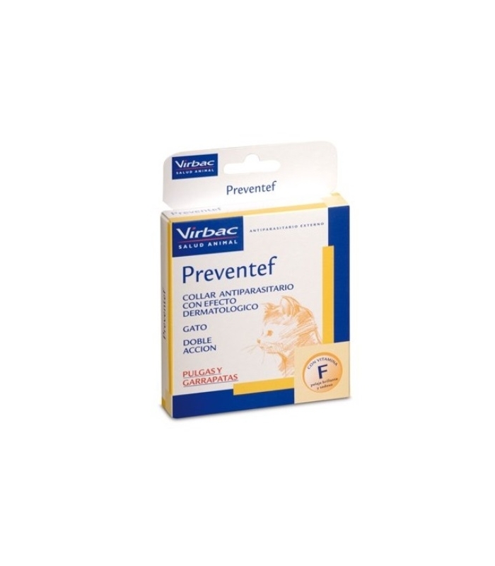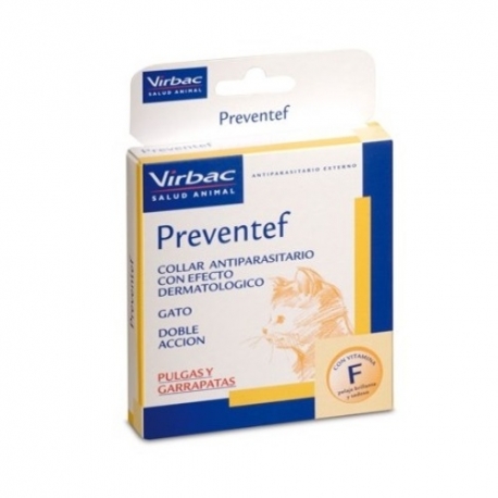 Preventef est un collier anti-puces et anti-tiques pour chat de la marque Virbac. Double action: prévention et effet dermatologique.